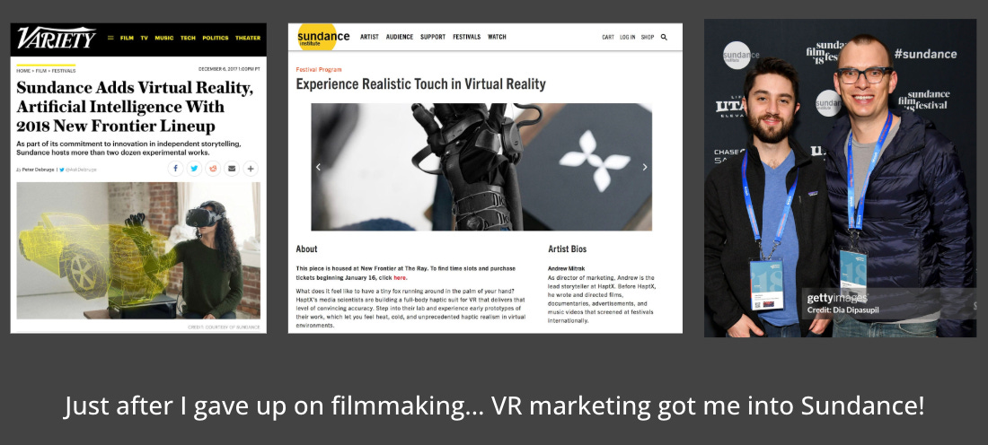 It was so funny that after I had given up on filmmaking, all of a sudden I got into Sundance as a virtual reality marketer, exploring this new medium as part of this team.