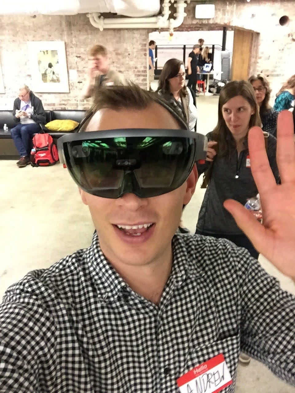 That is right, this is the Microsoft HoloLens, which was their augmented reality—they called it mixed reality—prototype. It was super early. I think they discontinued it a couple of years after this, but I was at a Seattle VR meetup. I was doing these 360-degree videos, going to Seattle VR meetups, learning about new tech, building a community, or being part of an emerging community, and getting to try out new tech. That was a sort of experimental augmented reality tool from Microsoft.