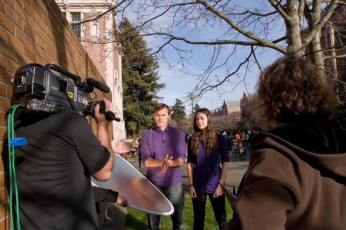 To place my career journey on a linear timeline, I would say the first era was being an undergraduate and I started making videos for the student newspaper. That turned into a job with UWTV; I made the first-ever student-produced TV show. While I was an undergrad, I was making 30-minute episodes a week. I was 19 years old when I started doing that, and all of a sudden, I was managing a staff of 15 people. I was the worst manager ever because no 19-year-old is a good manager, but I got a lot of practice making videos.