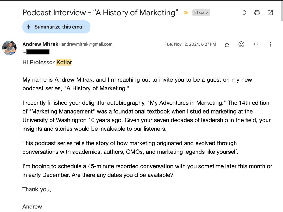There are a few things to unpack here. First, the podcast is called A History of Marketing. What guest doesn’t want to be part of history? If you are a marketer, the name itself lends itself to getting a guest. It isn’t “The Andrew Mitrak Podcast” that nobody would listen to and nobody wants to be part of.