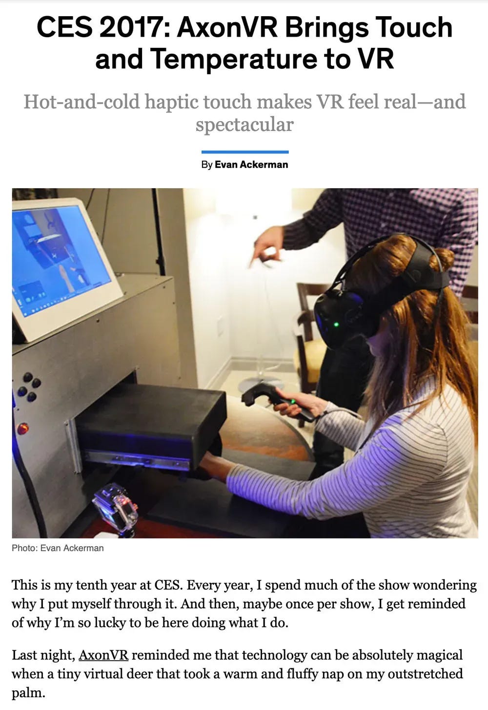 “This is my 10th year at CES. Every year I spend much of the show wondering why I put myself through it. And then maybe once per show, I get reminded of why I’m lucky to be doing what I do. Last night AxonVR reminded me that technology can be so absolutely magical when a tiny deer took a warm and fluffy nap on my outstretched palm.”