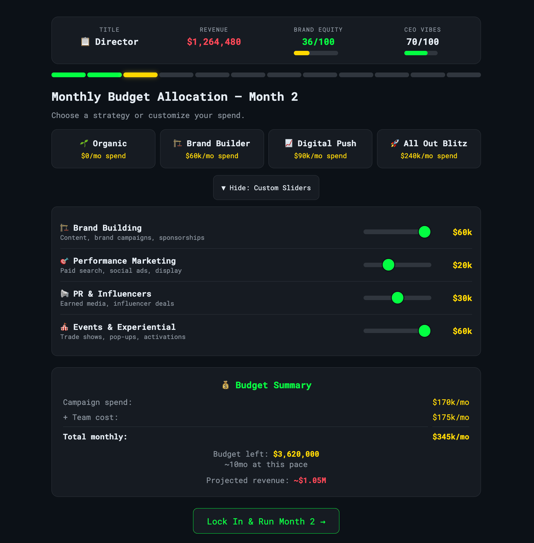 You start by picking a product: soda, shoes, skincare, or software. Then you lock in positioning: premium, value, lifestyle, or disruptor. Each combination has unique marketing channels and tactics that work best.