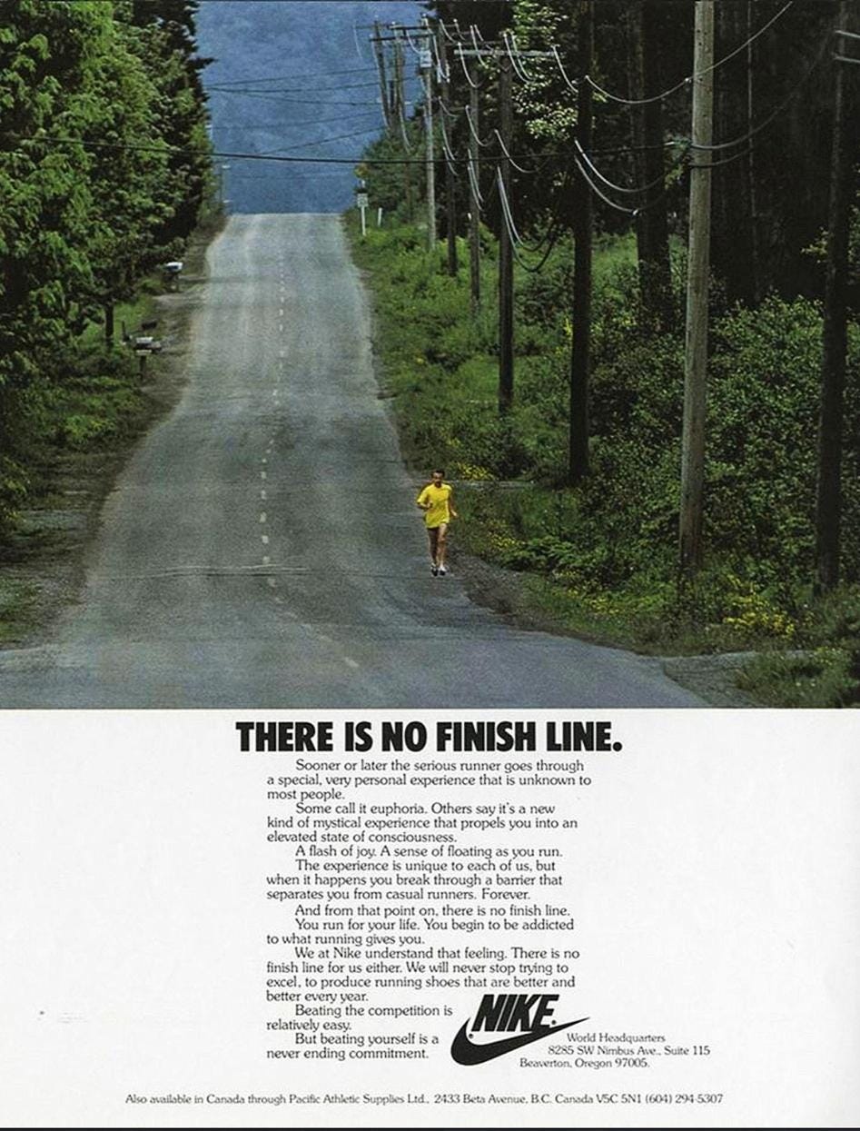 And then Denny Strickland, the art director for John Brown, and Bob Peterson, the photographer, had the brilliant idea to essentially create an atmosphere where you see a long way, a distance, in the distance there’s a runner running down a country road. So you can’t see the product. You wouldn’t know it’s Nike, literally, until you saw the bottom of the print ad. And that really became the first brand ad that Nike did. And it was mostly by the luck of the fact that we didn’t have product that month, and that John Brown had an inspiration, which is even more amazing because he told me he’s by far not a runner. Right? But he just felt like this was something that was like, to make them feel good, but it also meant like there is no finish line. So you ran a great race today, but tomorrow I bet you could do a little bit better because there is no finish line.