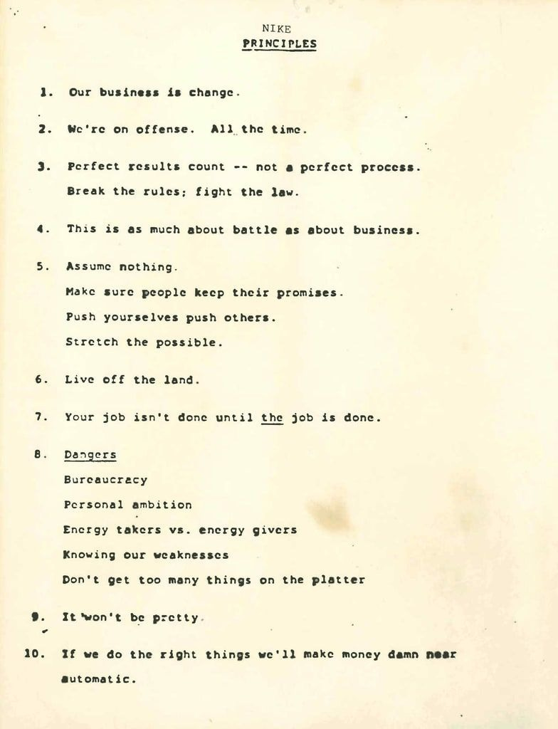 This is all in the late 70s. So yeah, we’re Nike now and Nike’s, you know, multi-kajillion dollar business, but not in 1977. So this was this was very heartfelt and there was a real concern that if people did start to put themselves first or start to push back on being asked to what they do, that the company may not survive. So with that context, these 10 principles, I think, resonate more.